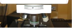 - Place appropriate filter above sample using the filter wheel. Green Fluorescent Protein (GFP) samples require blue excite filters